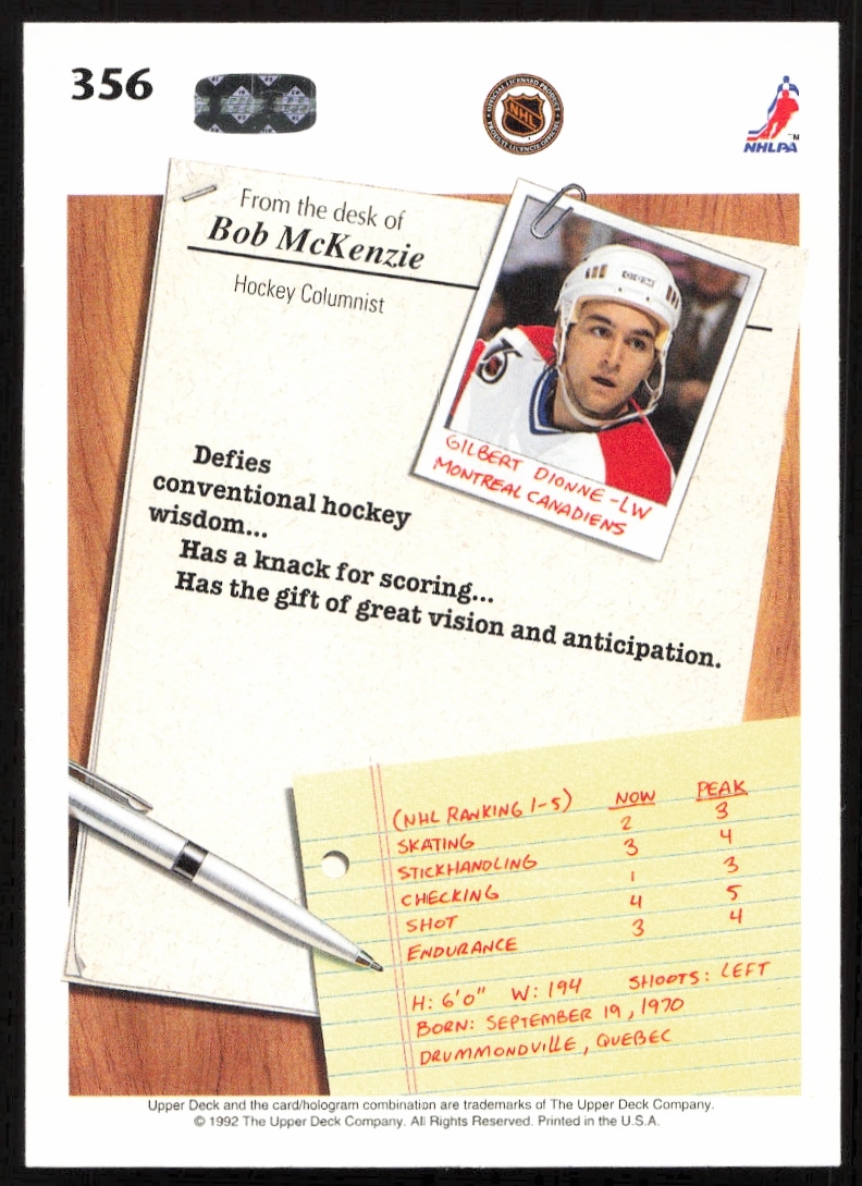 This Hockey card, from 1992-93 is part of the Upper Deck card set. Gilbert Dionne is featured and has a card number of 356.