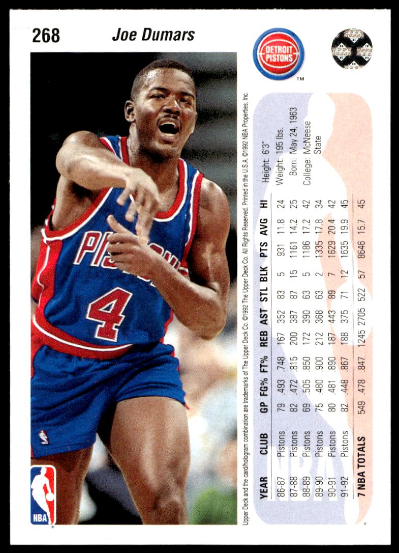 This BasketballΒ card, from 1992-93 is part of the Upper Deck Β card set. Joe Dumars is featured and has a card number of 268.