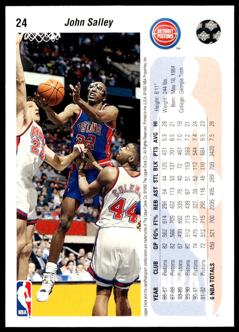 This Basketball card, from 1992-93 is part of the Upper Deck  card set. John Salley is featured and has a card number of 24.