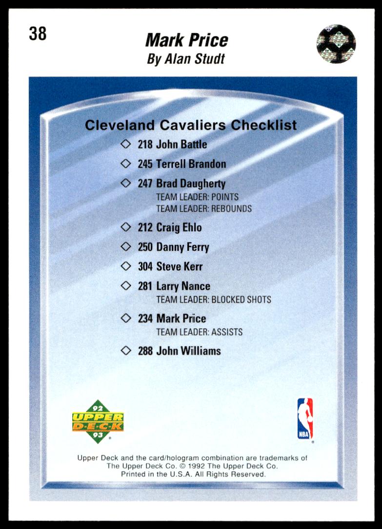 This Basketball card, from 1992-93 is part of the Upper Deck  card set. Mark Price is featured and has a card number of 38.