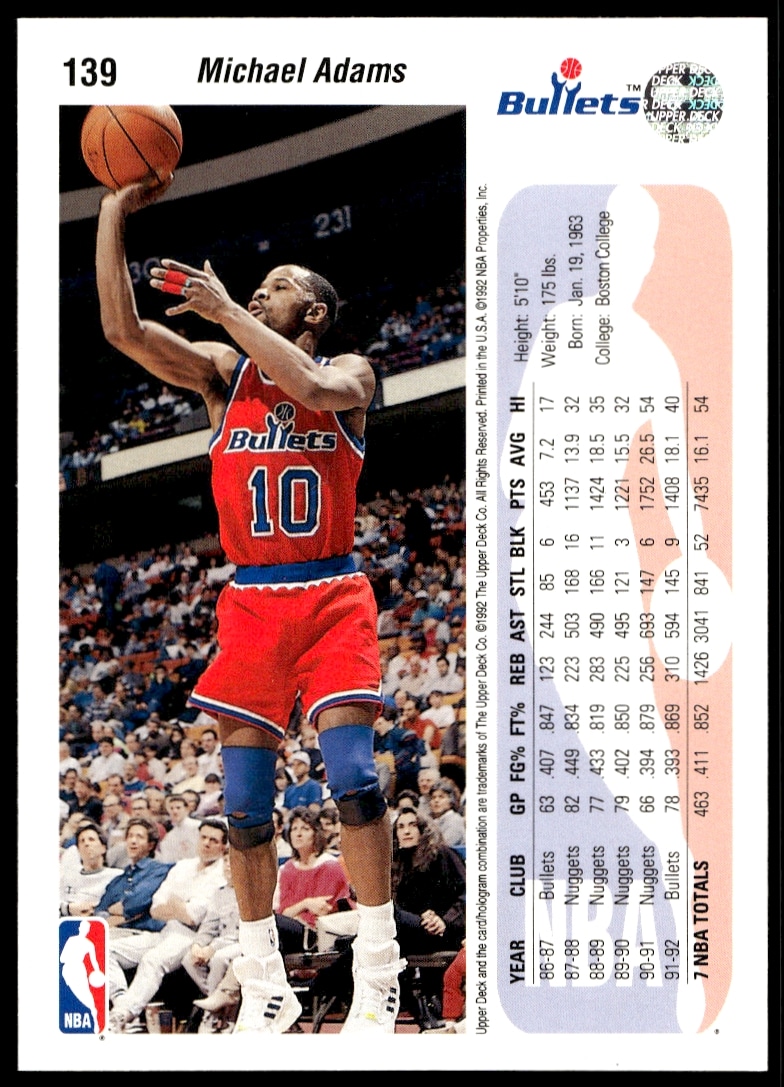 This Basketball card, from 1992-93 is part of the Upper Deck  card set. Michael Adams is featured and has a card number of 139.