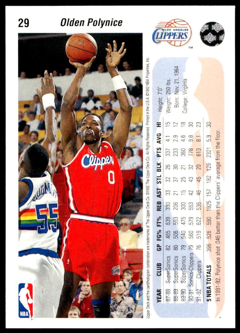 This Basketball card, from 1992-93 is part of the Upper Deck  card set. Olden Polynice is featured and has a card number of 29.