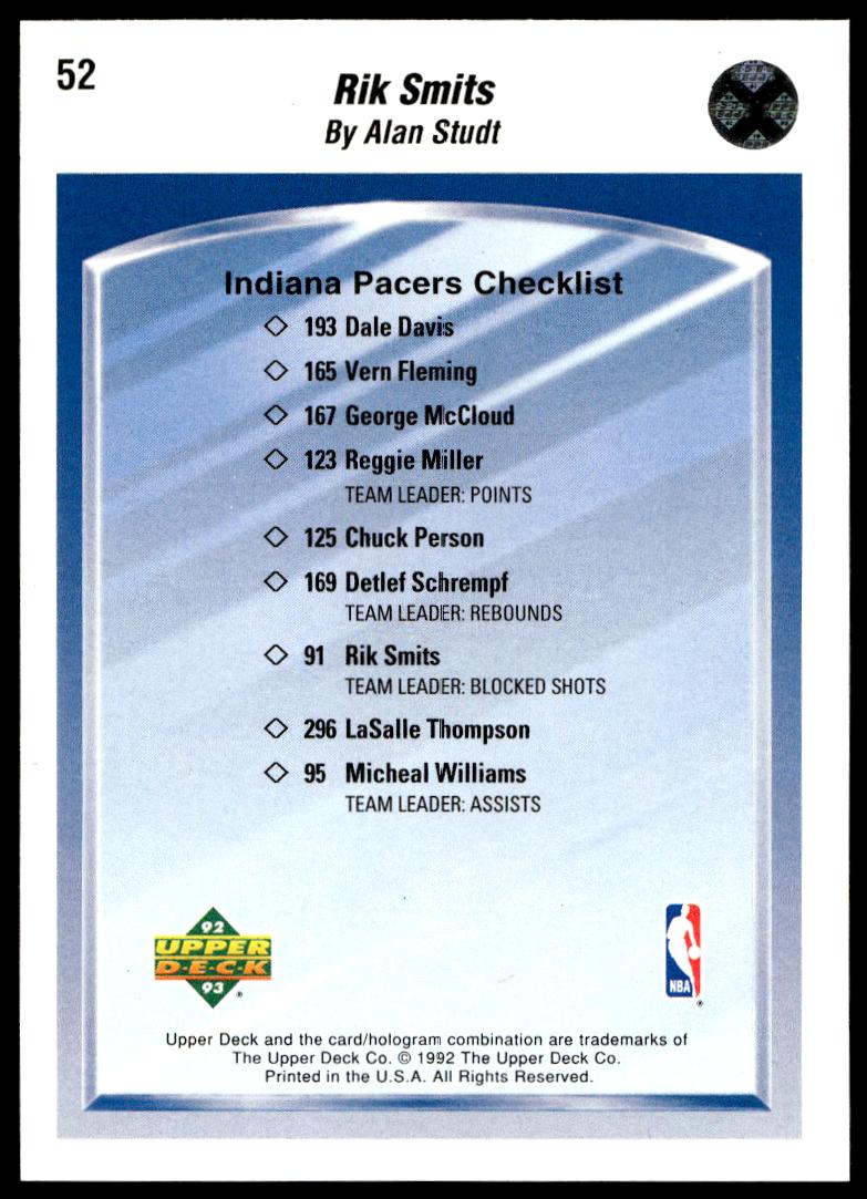 This Basketball card, from 1992-93 is part of the Upper Deck  card set. Rik Smits is featured and has a card number of 52.