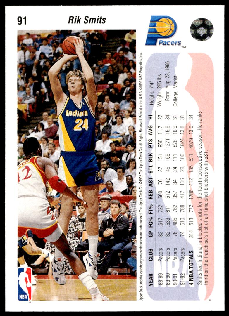 This Basketball card, from 1992-93 is part of the Upper Deck  card set. Rik Smits is featured and has a card number of 91.