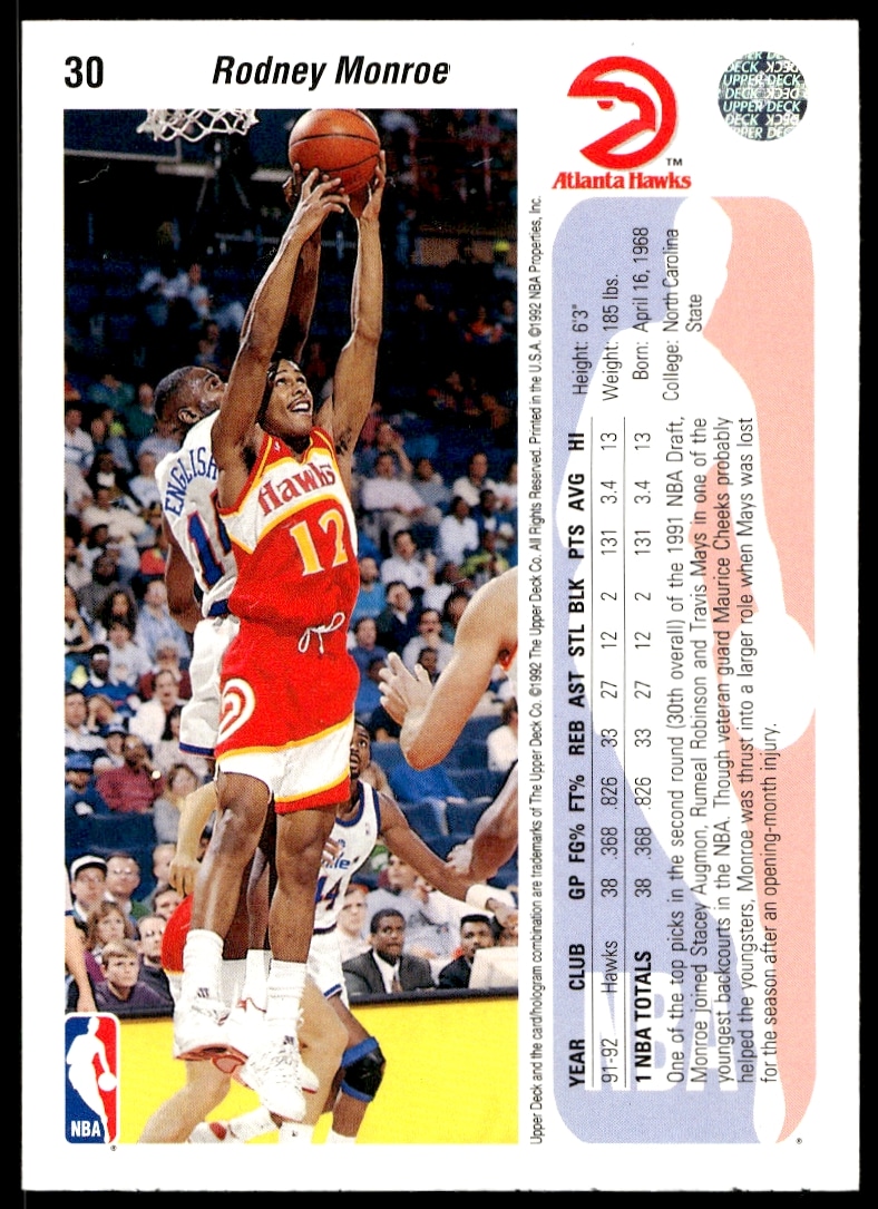 This BasketballΒ card, from 1992-93 is part of the Upper Deck Β card set. Rodney Monroe is featured and has a card number of 30.