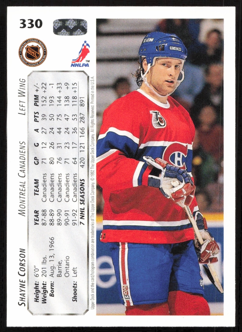 This Hockey card, from 1992-93 is part of the Upper Deck card set. Shayne Corson is featured and has a card number of 330.