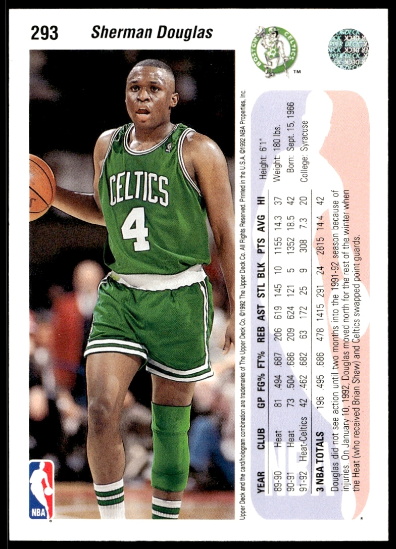 This Basketball card, from 1992-93 is part of the Upper Deck  card set. Sherman Douglas is featured and has a card number of 293.