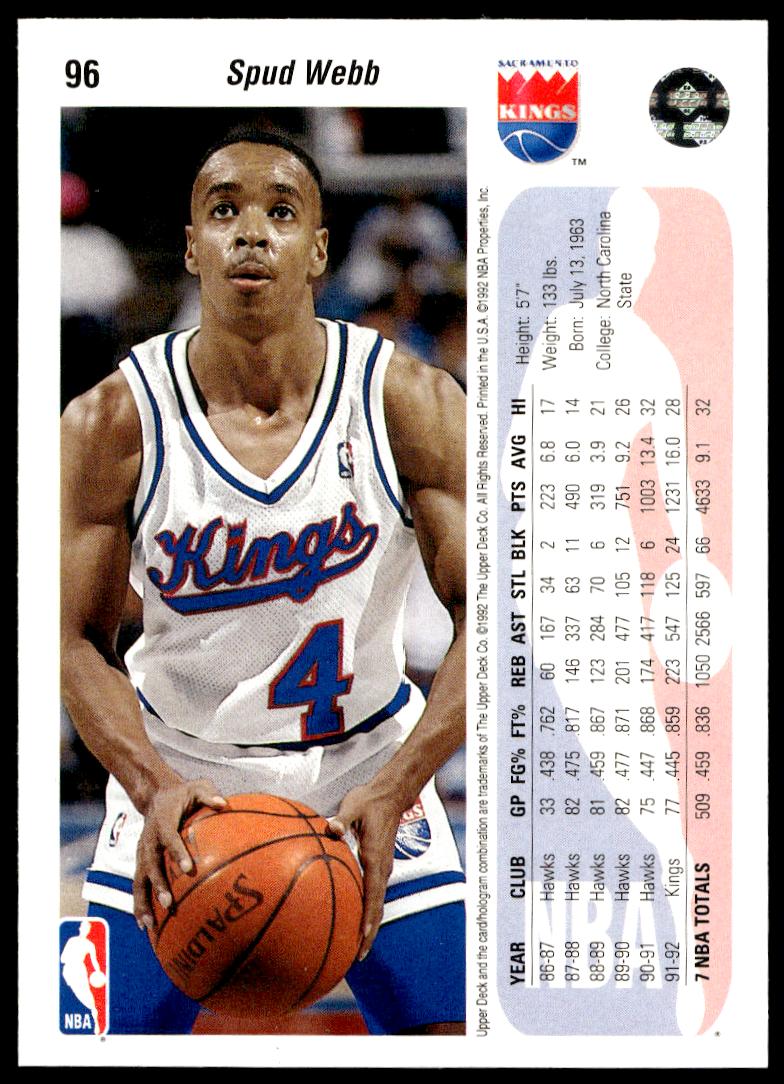 This Basketball card, from 1992-93 is part of the Upper Deck  card set. Spud Webb is featured and has a card number of 96.