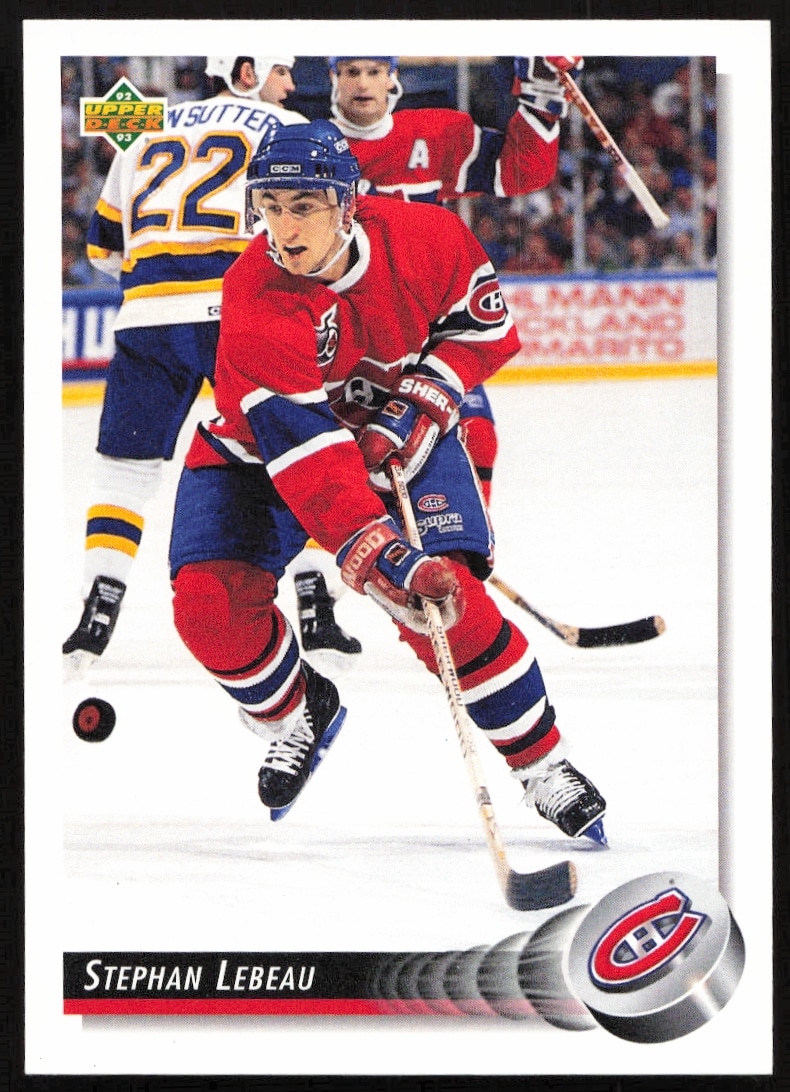 This Hockey card, from 1992-93 is part of the Upper Deck card set. Stephan Lebeau is featured and has a card number of 213.