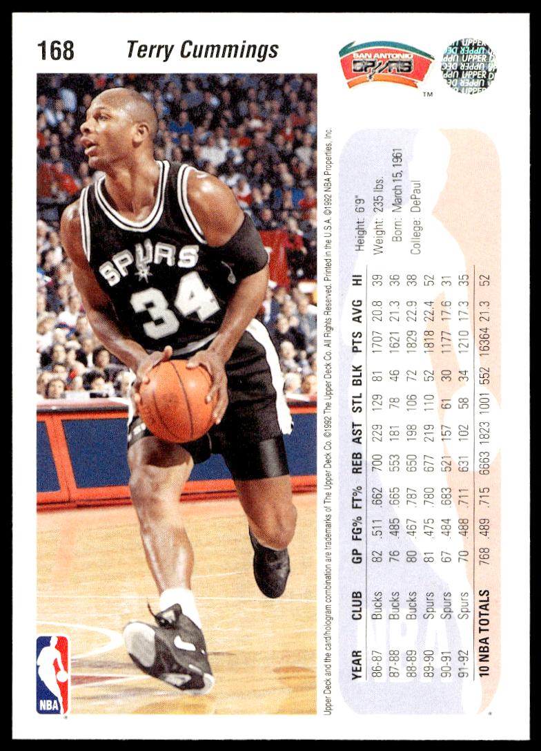 This BasketballΒ card, from 1992-93 is part of the Upper Deck Β card set. Terry Cummings is featured and has a card number of 168.