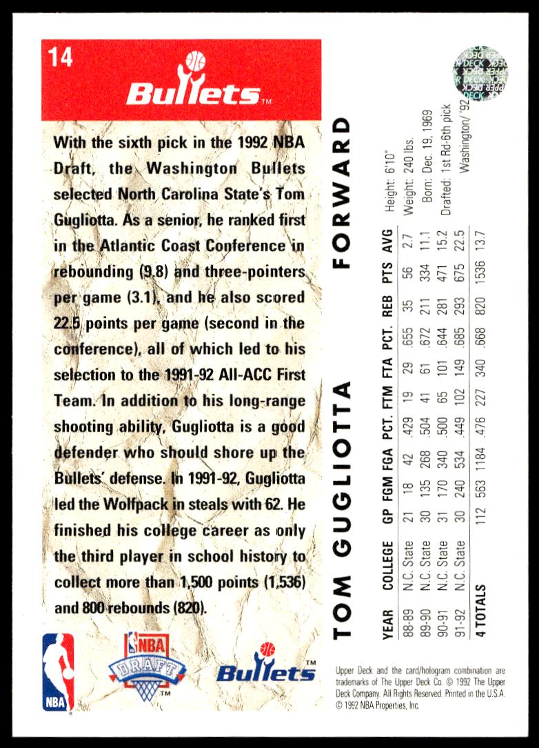 This BasketballΒ card, from 1992-93 is part of the Upper Deck Β card set. Tom Gugliotta is featured and has a card number of 14.