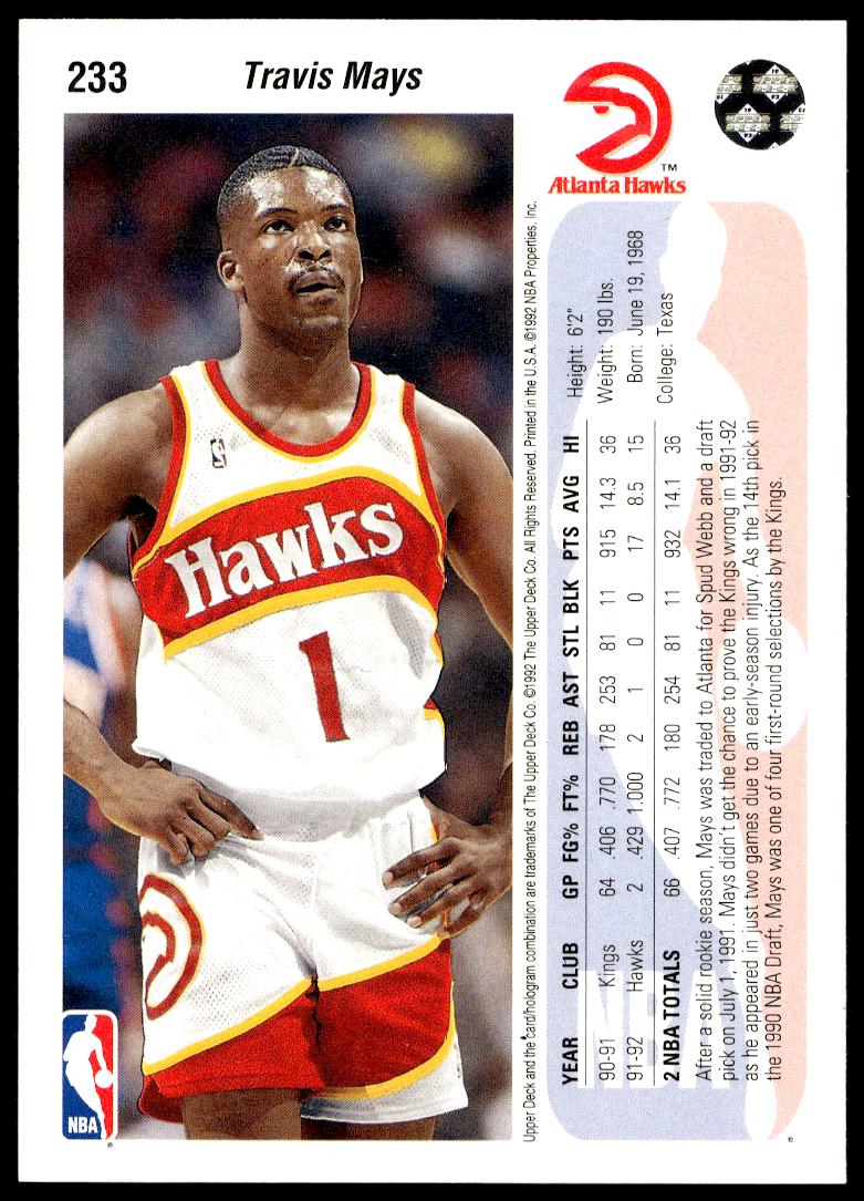 This BasketballΒ card, from 1992-93 is part of the Upper Deck Β card set. Travis Mays is featured and has a card number of 233.