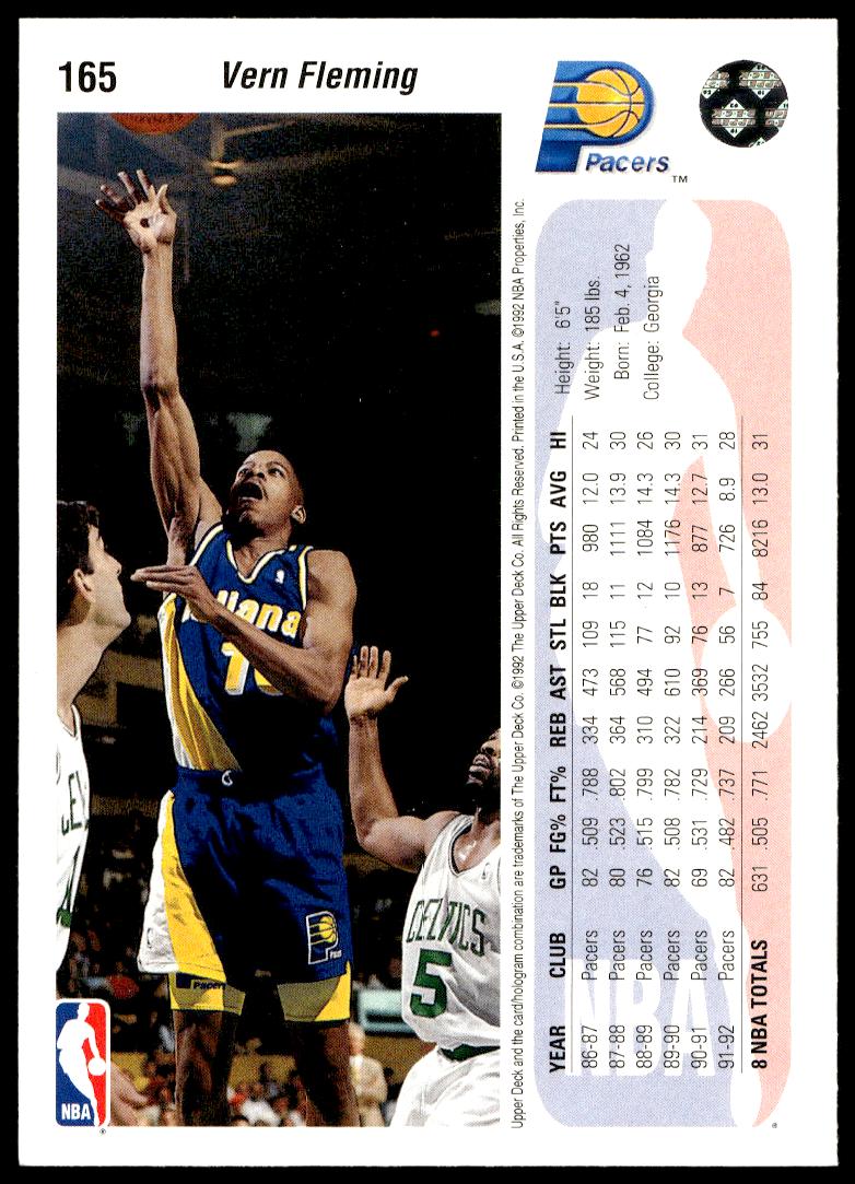 This BasketballΒ card, from 1992-93 is part of the Upper Deck Β card set. Vern Fleming is featured and has a card number of 165.