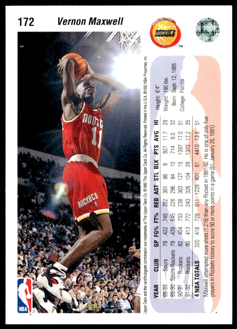 This BasketballΒ card, from 1992-93 is part of the Upper Deck Β card set. Vernon Maxwell is featured and has a card number of 172.