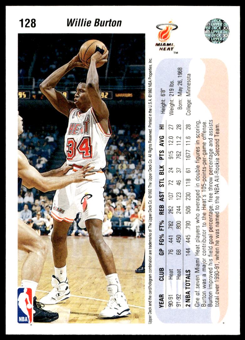 This BasketballΒ card, from 1992-93 is part of the Upper Deck Β card set. Willie Burton is featured and has a card number of 128.