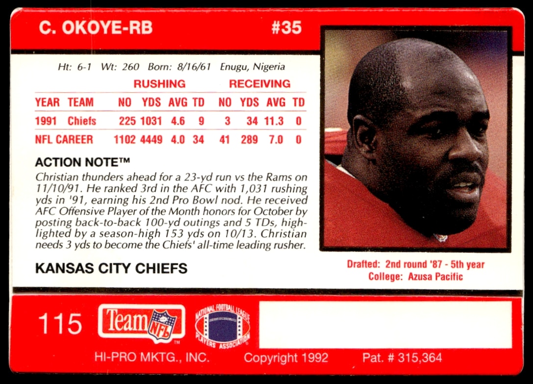 This Football card, from 1992 is part of the Action Packed card set. Christian Okoye is featured and has a card number of 115.