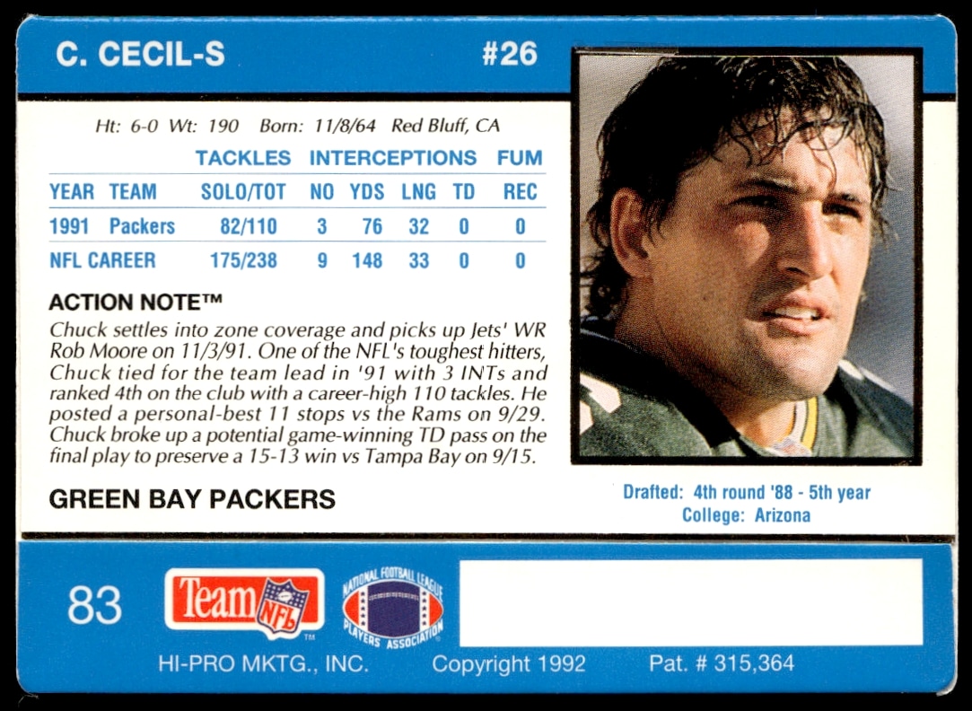 This Football card, from 1992 is part of the Action Packed card set. Chuck Cecil is featured and has a card number of 83.