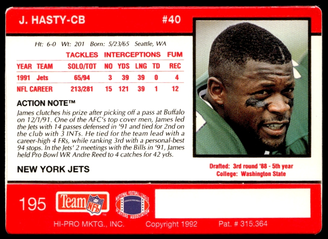 This Football card, from 1992 is part of the Action Packed card set. James Hasty is featured and has a card number of 195.