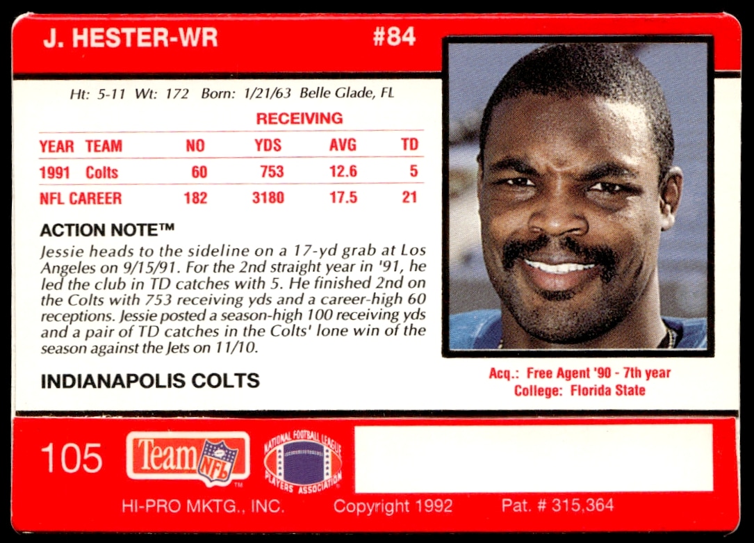 This Football card, from 1992 is part of the Action Packed card set. Jessie Hester is featured and has a card number of 105.