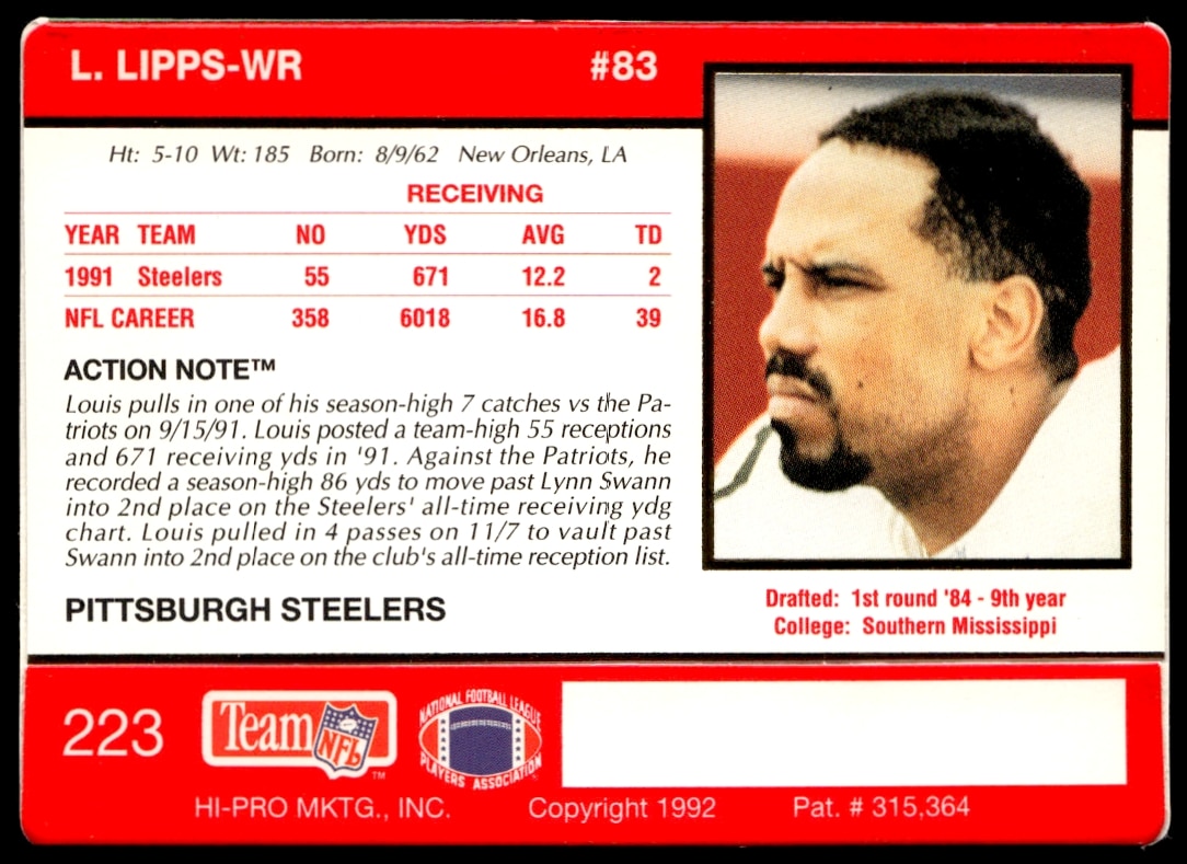This Football card, from 1992 is part of the Action Packed card set. Louis Lipps is featured and has a card number of 223.