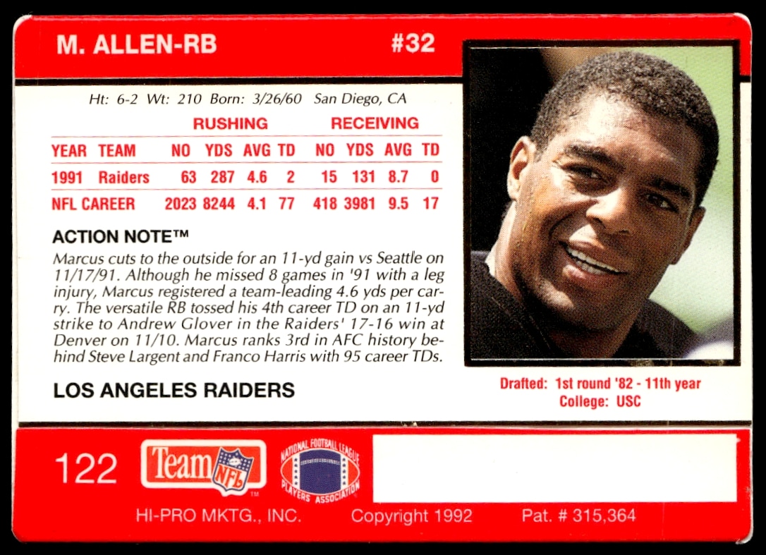 This Football card, from 1992 is part of the Action Packed card set. Marcus Allen is featured and has a card number of 122.