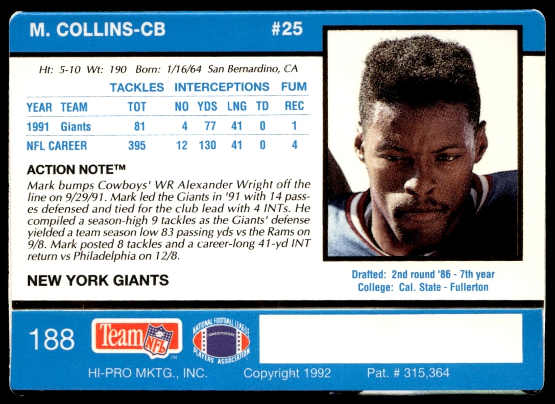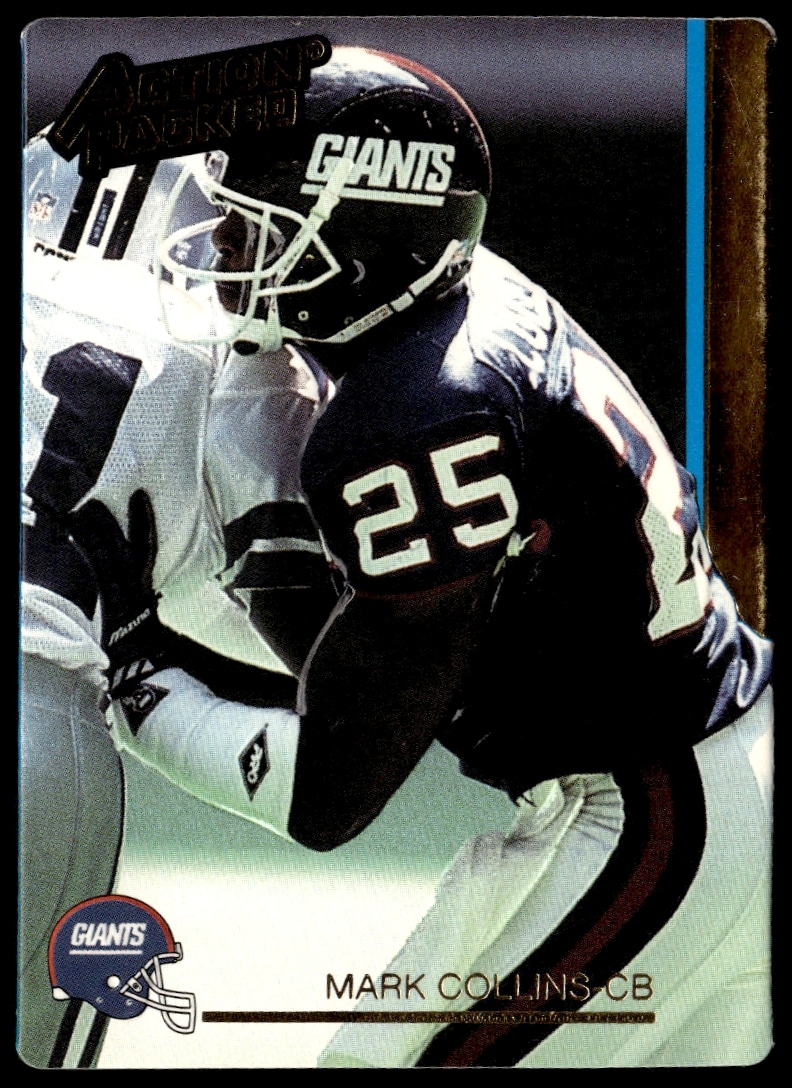 This Football card, from 1992 is part of the Action Packed card set. Mark Collins is featured and has a card number of 188.