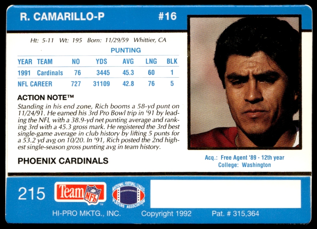 This Football card, from 1992 is part of the Action Packed card set. Rich Camarillo is featured and has a card number of 215.