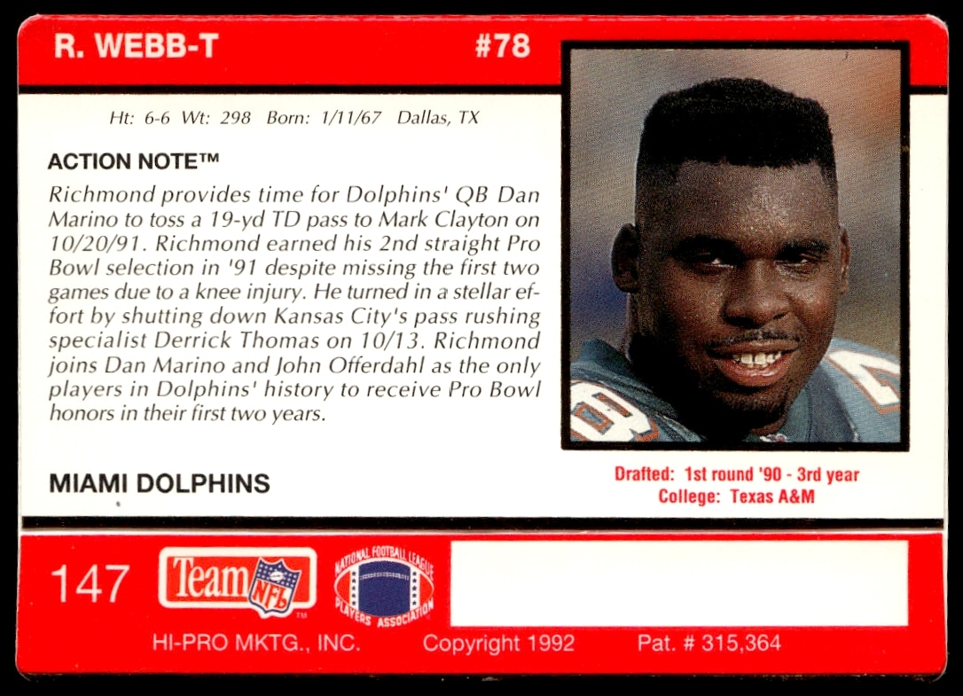 This Football card, from 1992 is part of the Action Packed card set. Richmond Webb is featured and has a card number of 147.