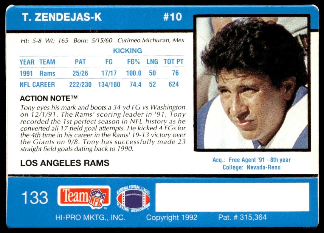 This Football card, from 1992 is part of the Action Packed card set. Tony Zendejas is featured and has a card number of 133.