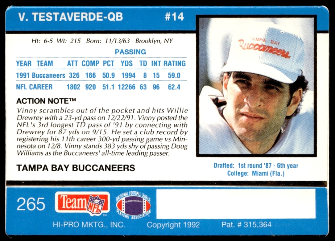 This Football card, from 1992 is part of the Action Packed card set. Vinny Testaverde is featured and has a card number of 265.
