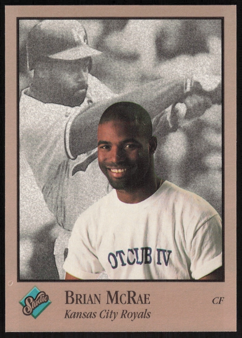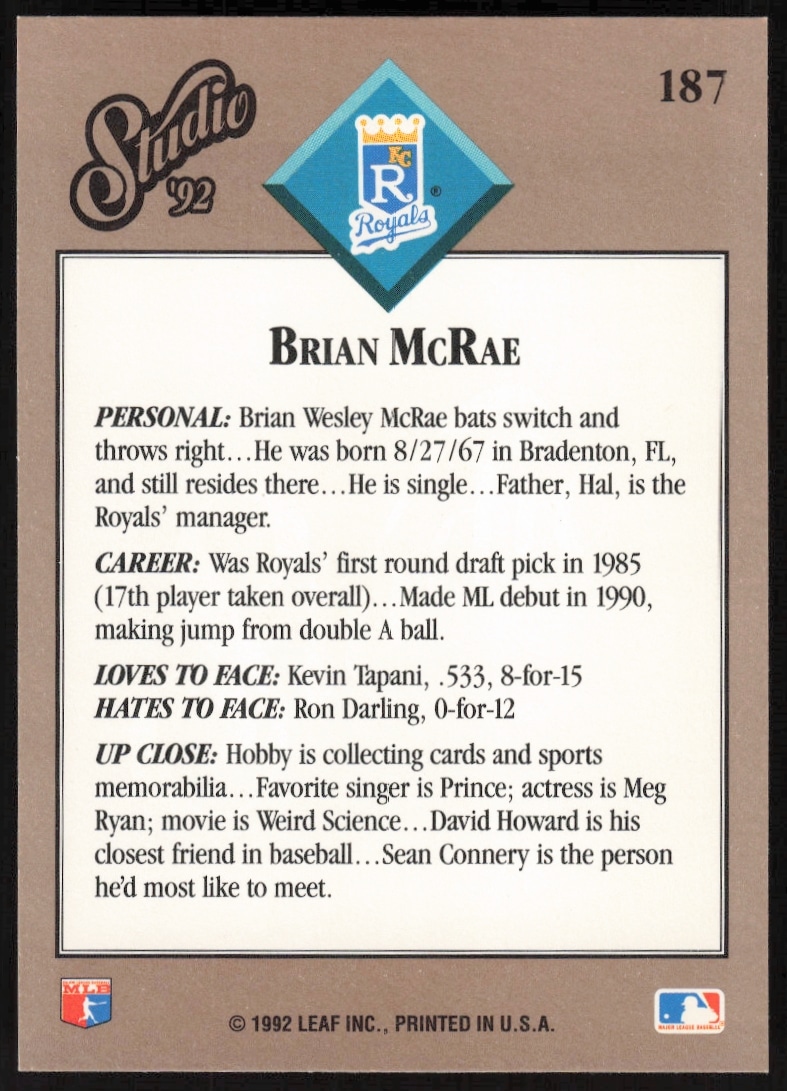 This Baseball card, from 1992 is part of the Leaf Studio card set. Brian McRae is featured and has a card number of 187.