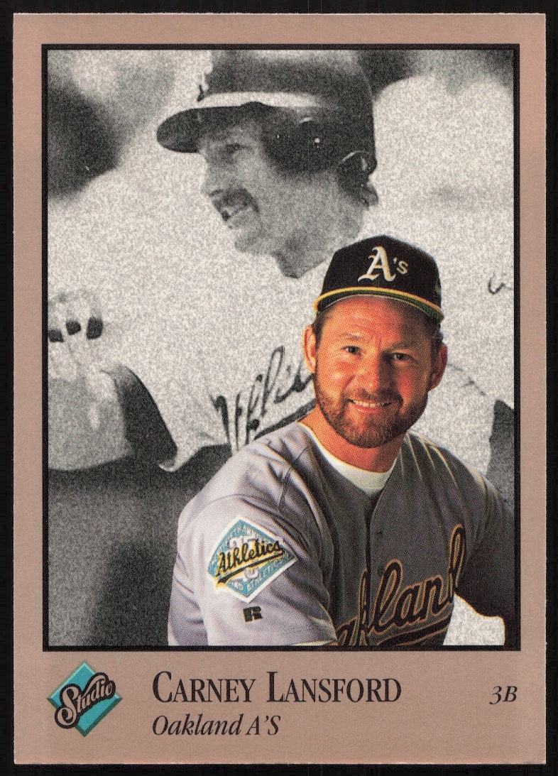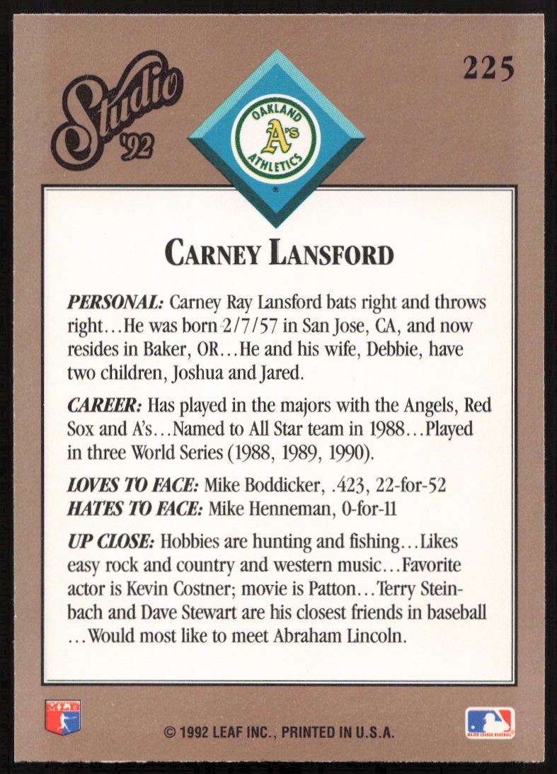 This Baseball card, from 1992 is part of the Leaf Studio card set. Carney Lansford is featured and has a card number of 225.