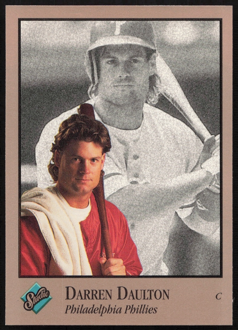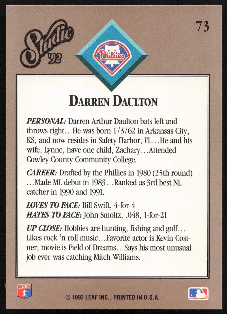 This Baseball card, from 1992 is part of the Leaf Studio card set. Darren Daulton is featured and has a card number of 73.