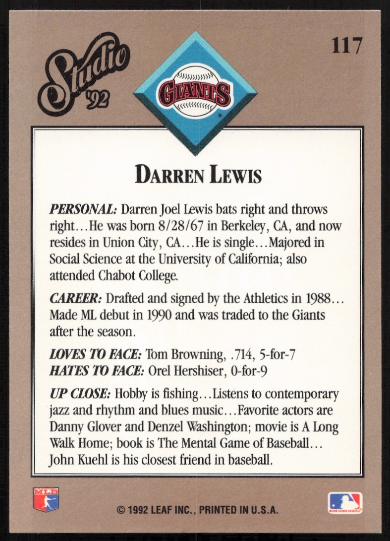 This Baseball card, from 1992 is part of the Leaf Studio card set. Darren Lewis is featured and has a card number of 117.
