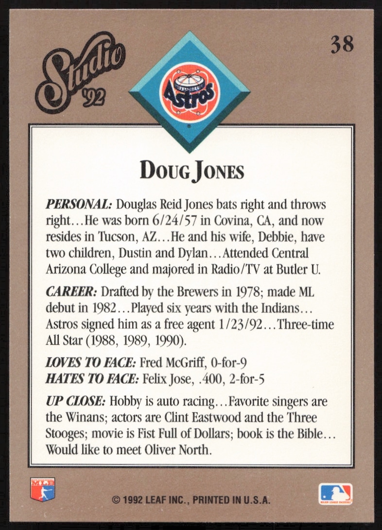 This Baseball card, from 1992 is part of the Leaf Studio card set. Doug Jones is featured and has a card number of 38.