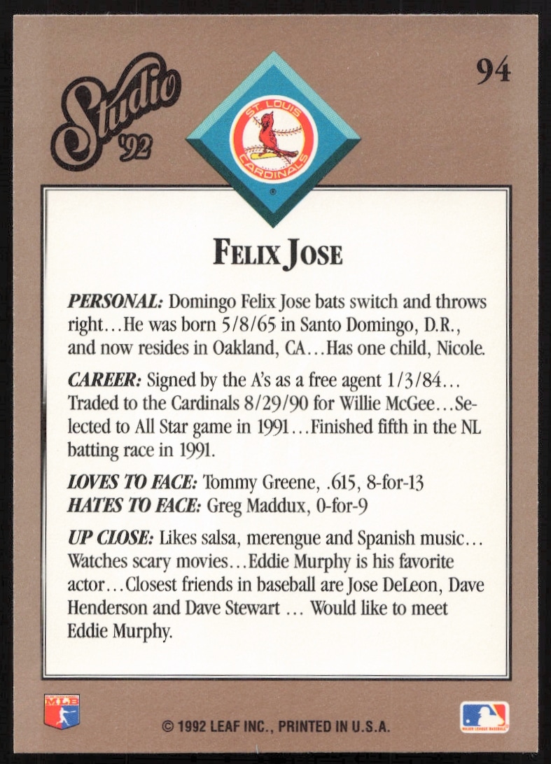 This Baseball card, from 1992 is part of the Leaf Studio card set. Felix Jose is featured and has a card number of 94.