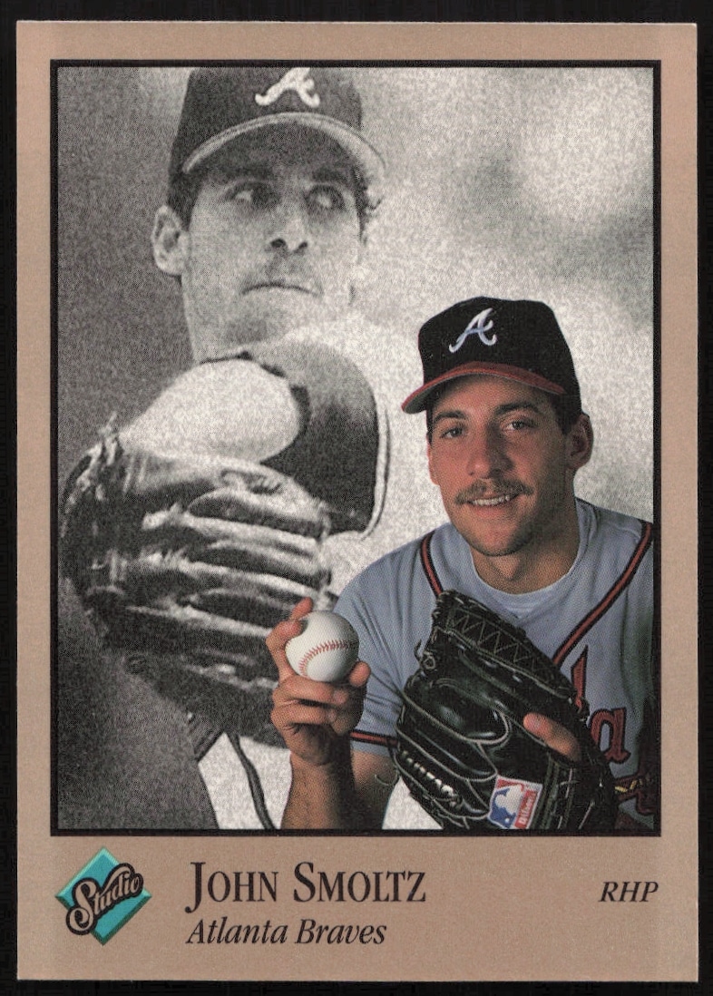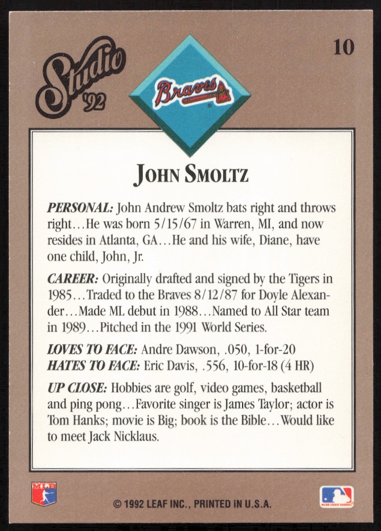 This Baseball card, from 1992 is part of the Leaf Studio card set. John Smoltz is featured and has a card number of 10.