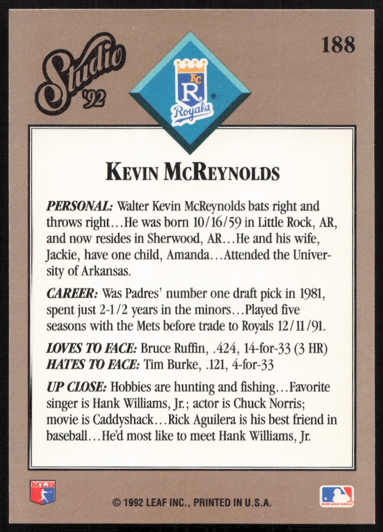 This Baseball card, from 1992 is part of the Leaf Studio card set. Kevin McReynolds is featured and has a card number of 188.