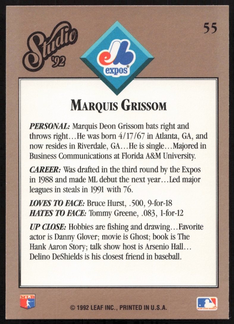 This Baseball card, from 1992 is part of the Leaf Studio card set. Marquis Grissom is featured and has a card number of 55.