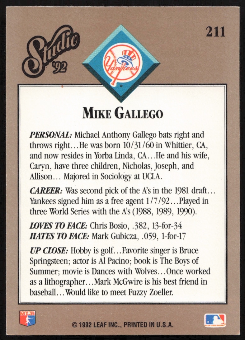 This Baseball card, from 1992 is part of the Leaf Studio card set. Mike Gallego is featured and has a card number of 211.