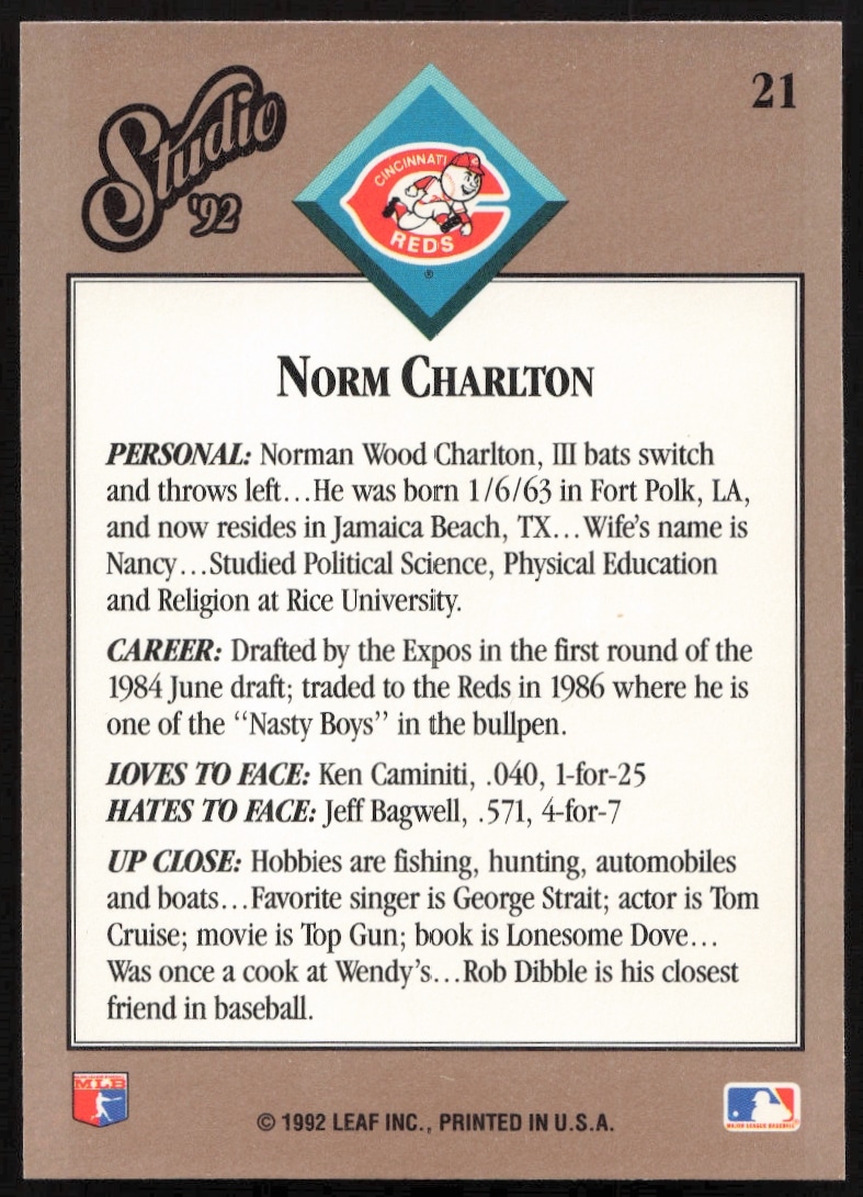 This Baseball card, from 1992 is part of the Leaf Studio card set. Norm Charlton is featured and has a card number of 21.