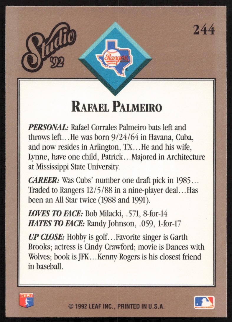 This Baseball card, from 1992 is part of the Leaf Studio card set. Rafael Palmeiro is featured and has a card number of 244.