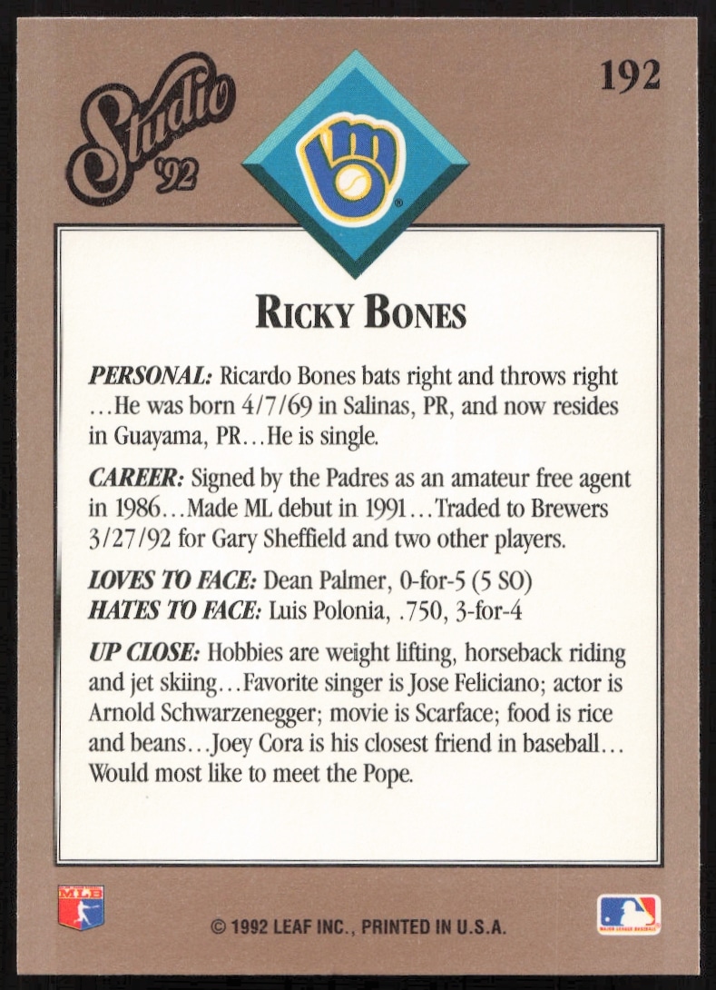This Baseball card, from 1992 is part of the Leaf Studio card set. Ricky Bones is featured and has a card number of 192.