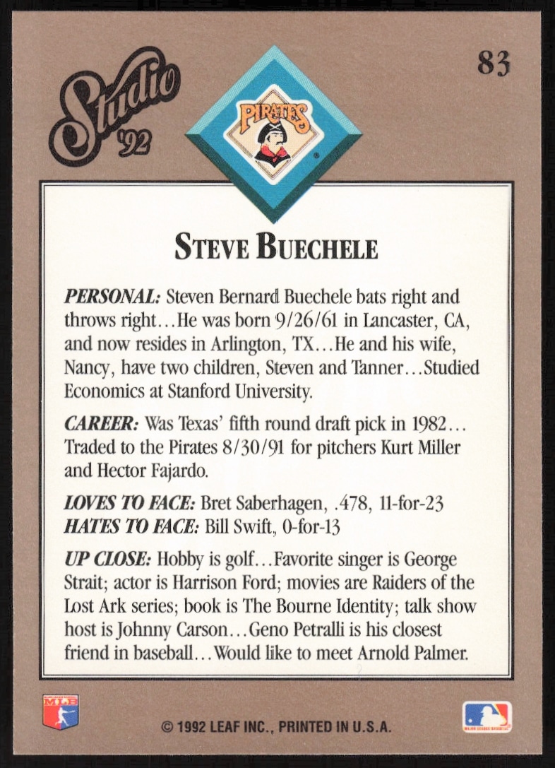 This Baseball card, from 1992 is part of the Leaf Studio card set. Steve Buechele is featured and has a card number of 83.