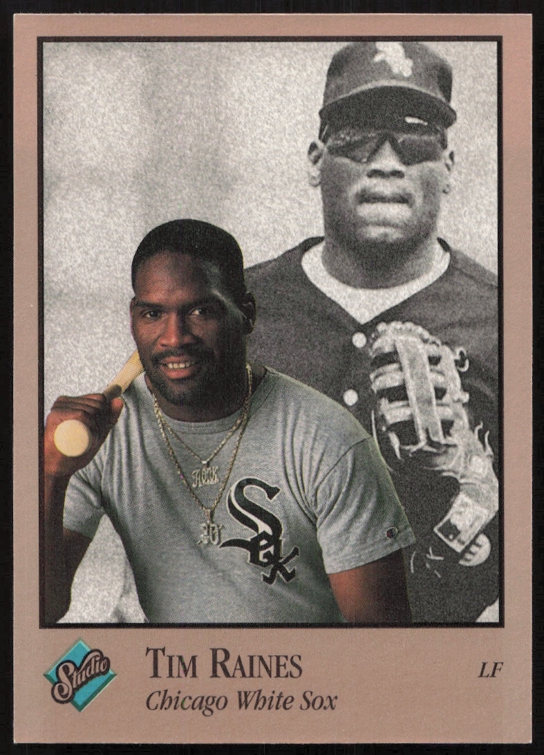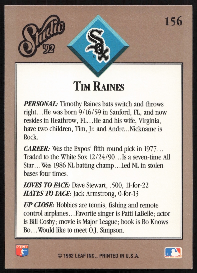 This Baseball card, from 1992 is part of the Leaf Studio card set. Tim Raines is featured and has a card number of 156.