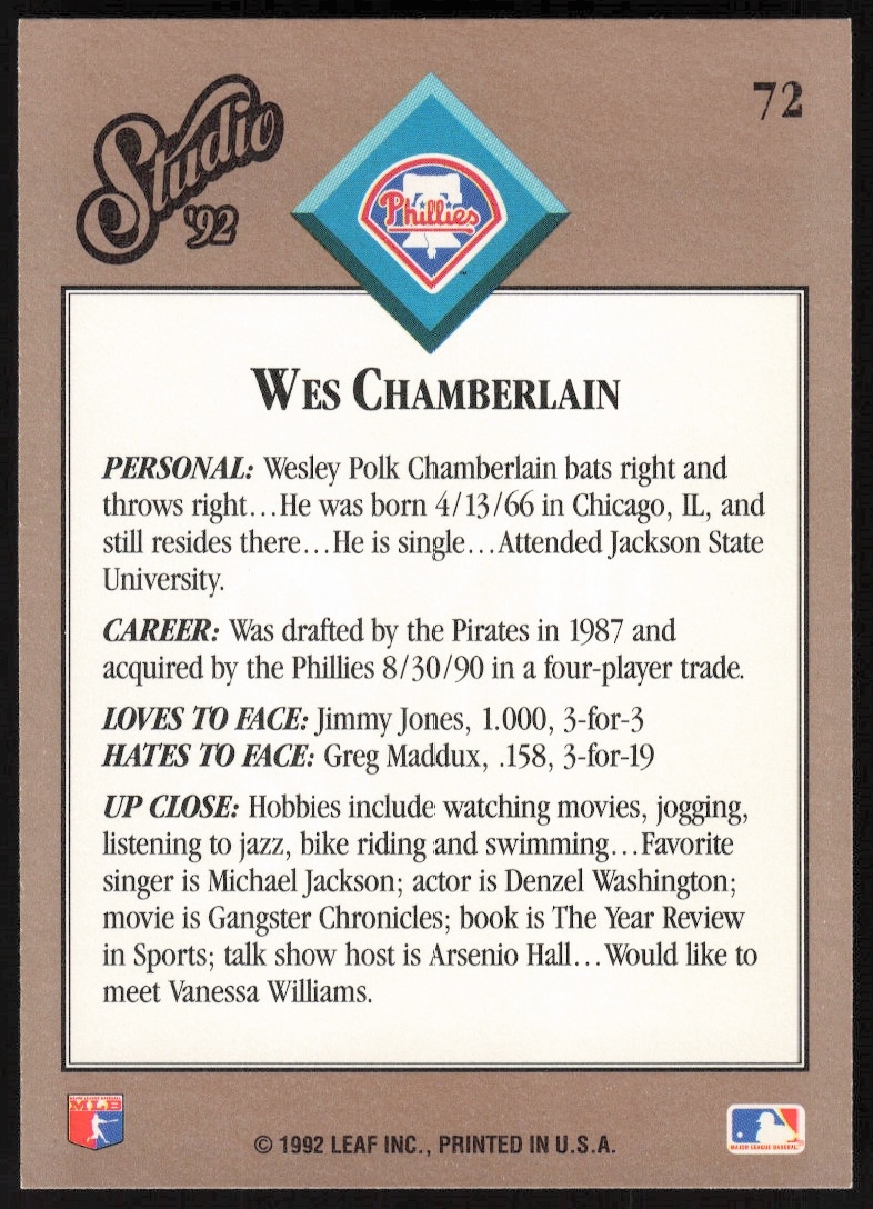 This Baseball card, from 1992 is part of the Leaf Studio card set. Wes Chamberlain is featured and has a card number of 72.