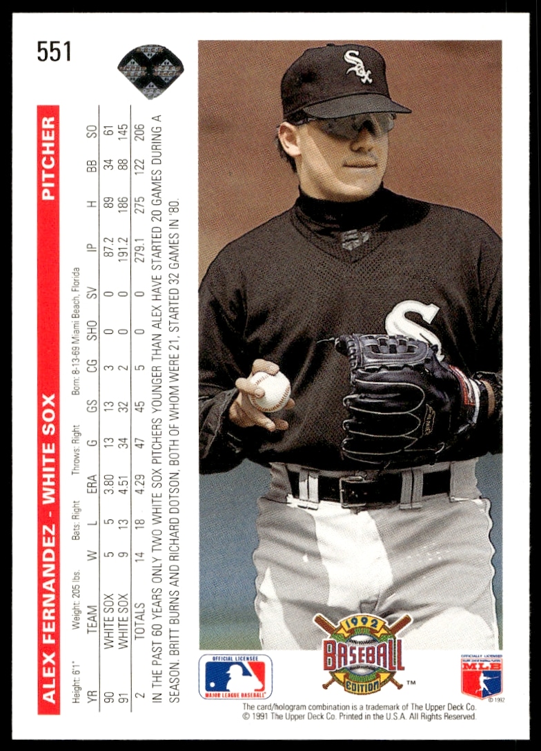 This Baseball card, from 1992 is part of the Upper Deck card set. Alex Fernandez is featured and has a card number of 551.