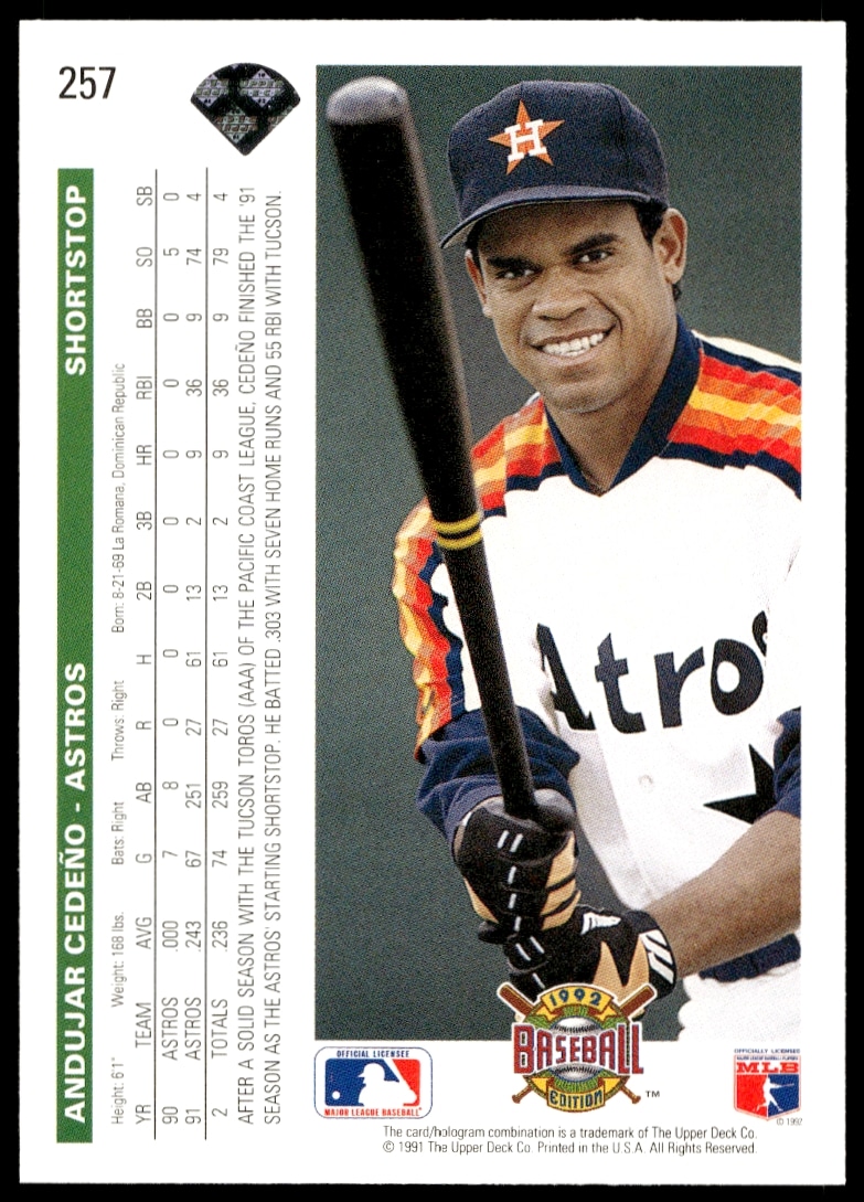 This Baseball card, from 1992 is part of the Upper Deck card set. Andujar Cedeno is featured and has a card number of 257.