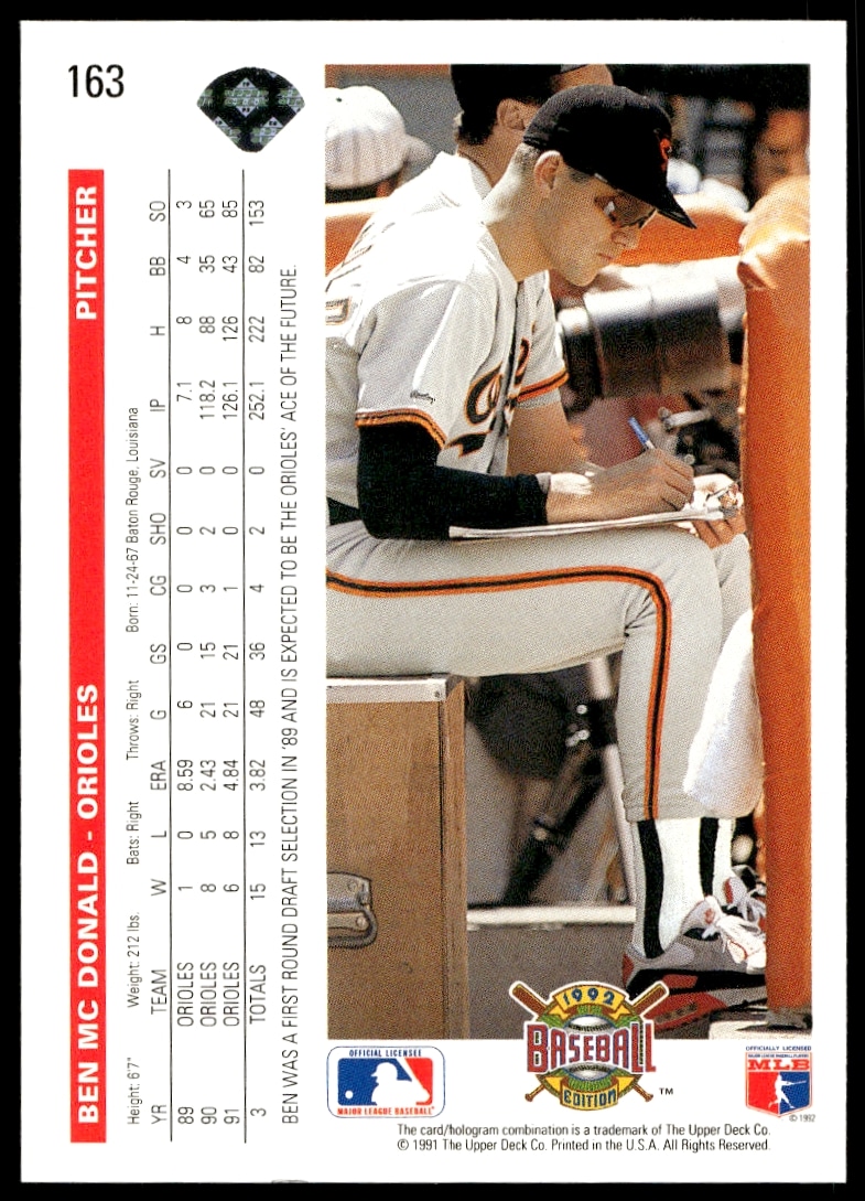 This Baseball card, from 1992 is part of the Upper Deck card set. Ben McDonald is featured and has a card number of 163.