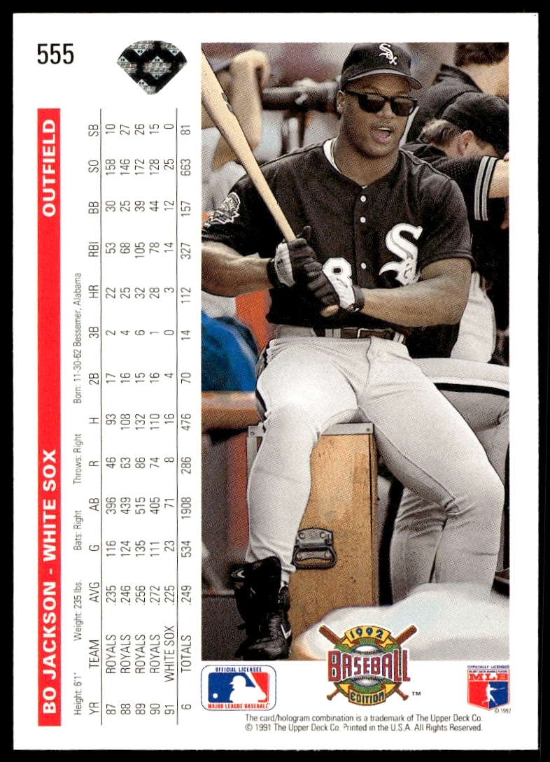 This Baseball card, from 1992 is part of the Upper Deck card set. Bo Jackson is featured and has a card number of 555.